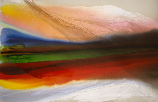 Nous vous proposons une reproduction artisanale sur toile du célèbre tableau 'titre inconnu' de Paul Jenkins, provenant du Musée de la Reproduction.