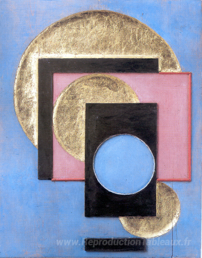 Nous vous proposons une reproduction artisanale sur toile du célèbre tableau 'Trois cercles d'or avec boucle bleu' de Erich Buchholz, provenant du Musée de la Reproduction.