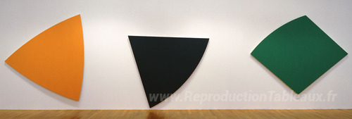 Nous vous proposons une reproduction artisanale sur toile du célèbre tableau 'Trois panneaux. Orange, gris foncé, vert' de Ellsworth Kelly, provenant du Musée de la Reproduction.