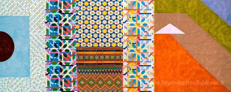 Nous vous proposons une reproduction artisanale sur toile du célèbre tableau 'Trois portails… triangle rose' de Joyce Kozloff, provenant du Musée de la Reproduction.