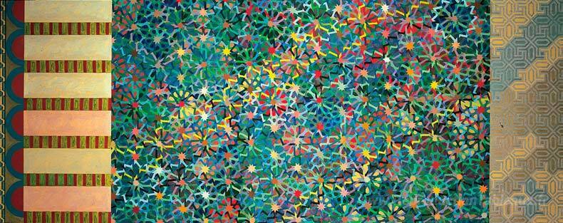 Nous vous proposons une reproduction artisanale sur toile du célèbre tableau 'Un labyrinthe' de Joyce Kozloff, provenant du Musée de la Reproduction.