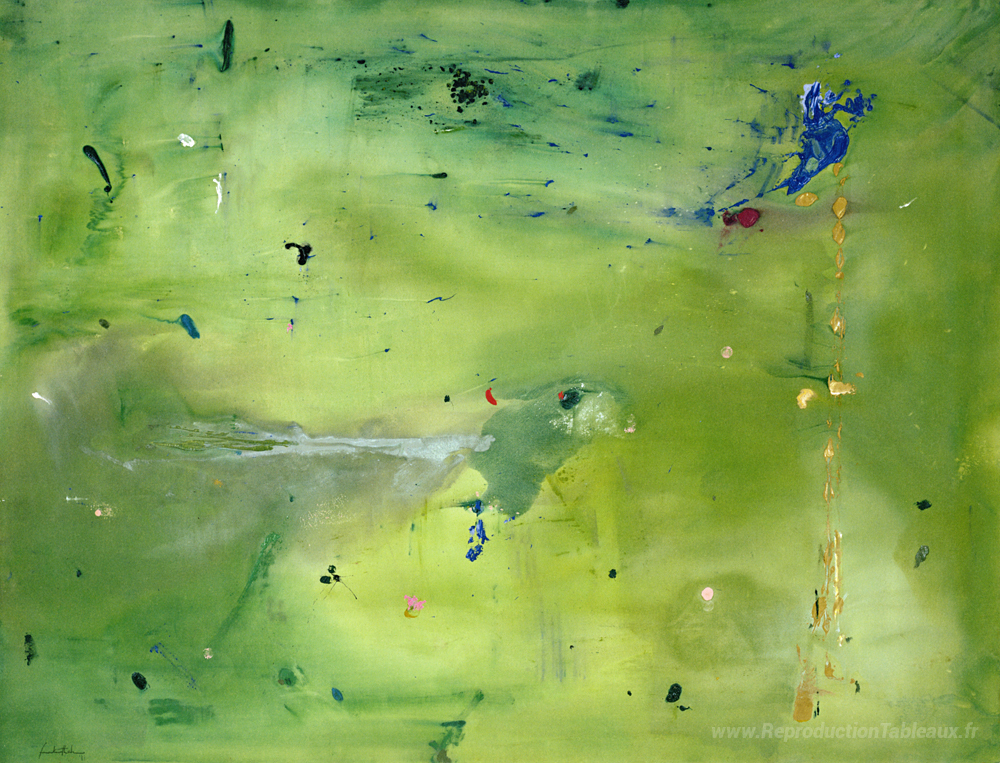 Nous vous proposons une reproduction artisanale sur toile du célèbre tableau 'Une pensée verte dans une teinte verte' de Helen Frankenthaler, provenant du Musée de la Reproduction.