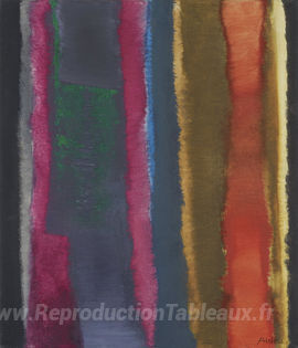 Nous vous proposons une reproduction artisanale sur toile du célèbre tableau 'Vertikal' de Fritz Winter, provenant du Musée de la Reproduction.