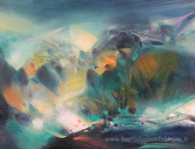 Nous vous proposons une reproduction artisanale sur toile du célèbre tableau 'Vivante Sérénité des neiges' de Chu Teh-Chun, provenant du Musée de la Reproduction.