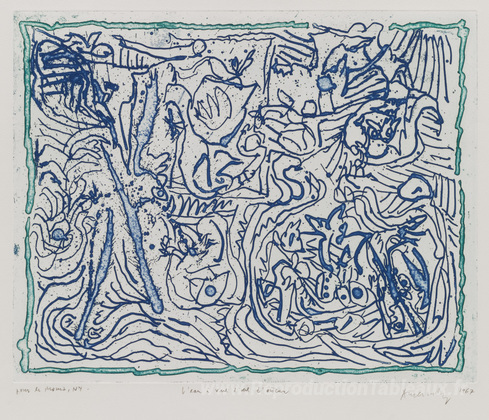 Nous vous proposons une reproduction artisanale sur toile du célèbre tableau 'Vue dans l'oeil de la mer (l'Eau à Vue d'Oeil d'Oiseau)' de Pierre Alechinsky, provenant du Musée de la Reproduction.