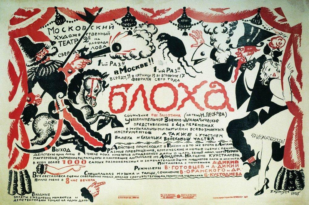 Nous vous proposons une reproduction artisanale sur toile du célèbre tableau 'Affiche de la pièce "Flea"' de Boris Kustodiev, provenant du Musée de la Reproduction.