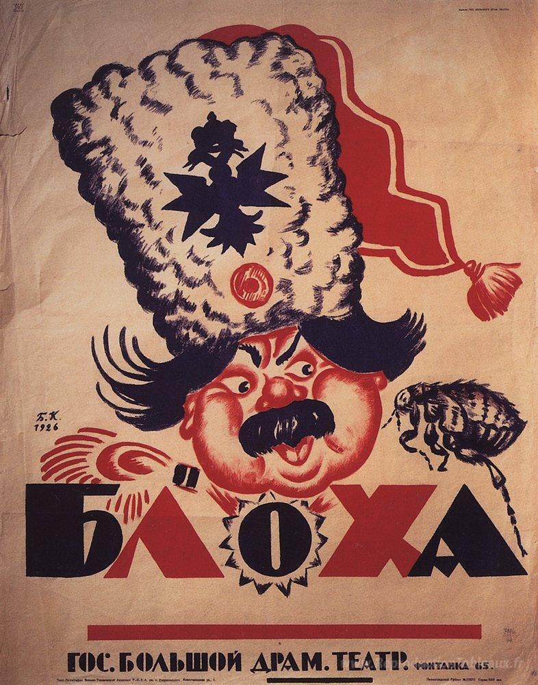 Nous vous proposons une reproduction artisanale sur toile du célèbre tableau 'Affiche de la pièce "Flea"' de Boris Kustodiev, provenant du Musée de la Reproduction.
