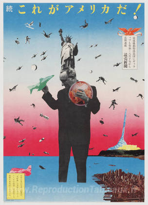 Nous vous proposons une reproduction artisanale sur toile du célèbre tableau 'C'est l'Amérique' de Tadanori Yokoo, provenant du Musée de la Reproduction.