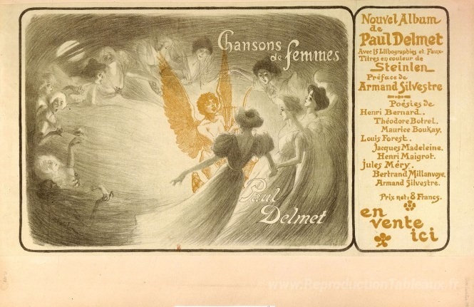 Nous vous proposons une reproduction artisanale sur toile du célèbre tableau 'Chansons de femmes' de Theophile Steinlen, provenant du Musée de la Reproduction.