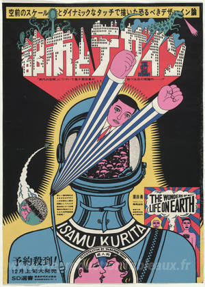 Nous vous proposons une reproduction artisanale sur toile du célèbre tableau 'La ville et le design, les merveilles de la vie sur terre, Isamu' de Tadanori Yokoo, provenant du Musée de la Reproduction.