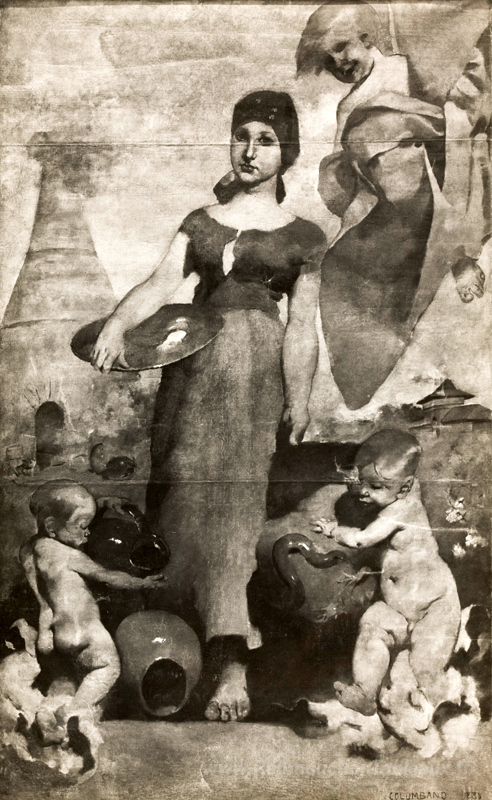 Nous vous proposons une reproduction artisanale sur toile du célèbre tableau 'Allégorie de la peinture en céramique' de Columbano Bordalo Pinheiro, provenant du Musée de la Reproduction.