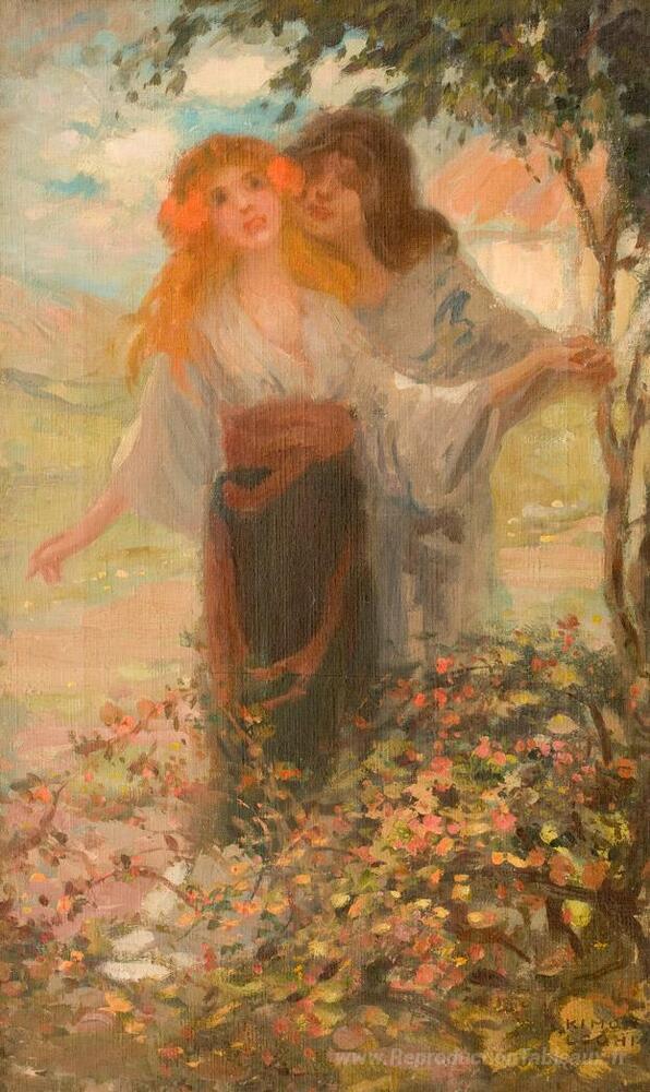 Nous vous proposons une reproduction artisanale sur toile du célèbre tableau 'Allégorie du printemps' de Kimon Loghi, provenant du Musée de la Reproduction.