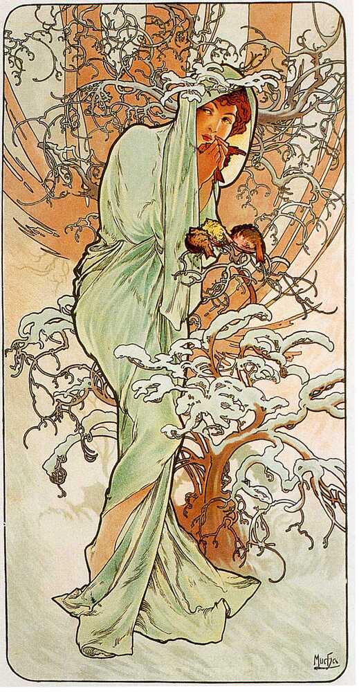 Nous vous proposons une reproduction artisanale sur toile du célèbre tableau 'Hiver' de Alphonse Mucha, provenant du Musée de la Reproduction.
