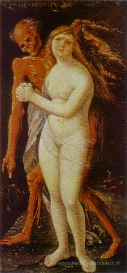 Nous vous proposons une reproduction artisanale sur toile du célèbre tableau 'Jeune femme et mort' de Hans Baldung, provenant du Musée de la Reproduction.