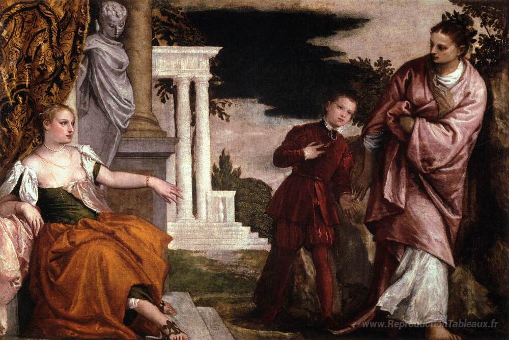 Nous vous proposons une reproduction artisanale sur toile du célèbre tableau 'Jeunesse entre vertu et vice' de Paolo Veronese, provenant du Musée de la Reproduction.