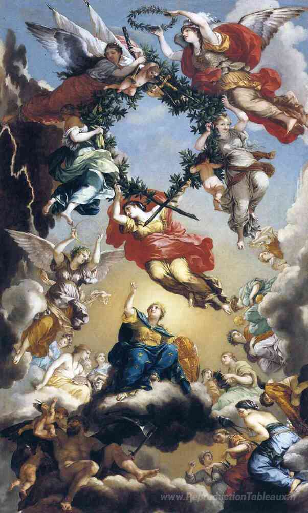 Nous vous proposons une reproduction artisanale sur toile du célèbre tableau 'La glorification du gouvernement bordeaux' de Pierre-Paul Prud'hon, provenant du Musée de la Reproduction.
