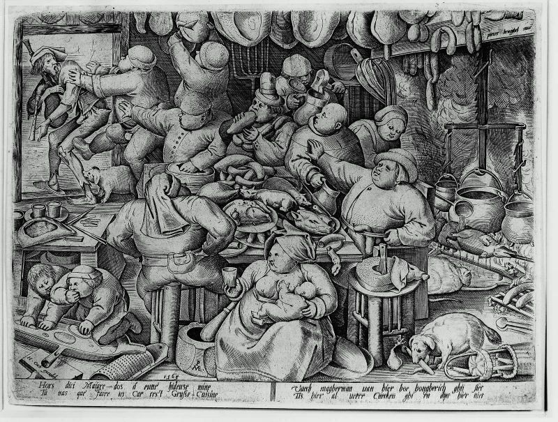 Nous vous proposons une reproduction artisanale sur toile du célèbre tableau 'La grosse cuisine' de Pieter Bruegel the Elder, provenant du Musée de la Reproduction.