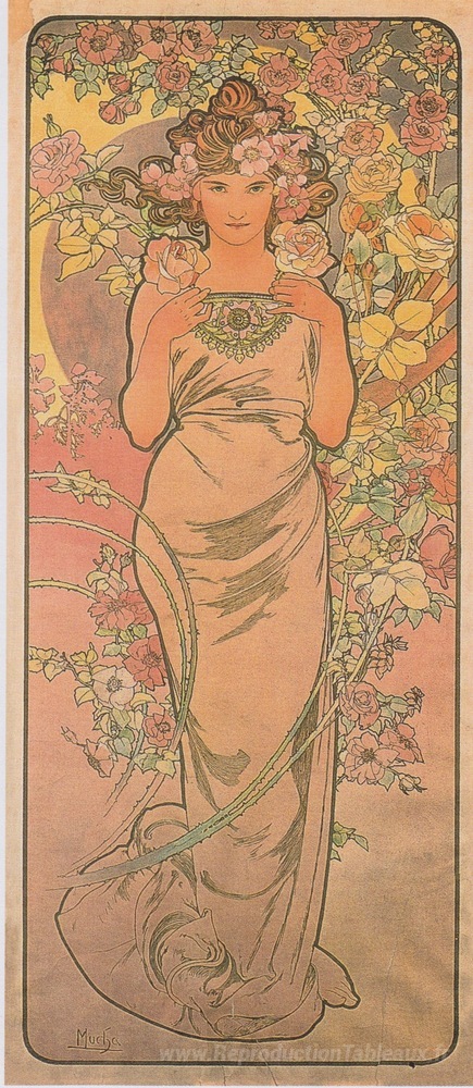 Nous vous proposons une reproduction artisanale sur toile du célèbre tableau 'La rose' de Alphonse Mucha, provenant du Musée de la Reproduction.