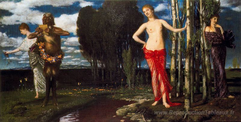Nous vous proposons une reproduction artisanale sur toile du célèbre tableau 'Le ressort de réveil' de Arnold Böcklin, provenant du Musée de la Reproduction.