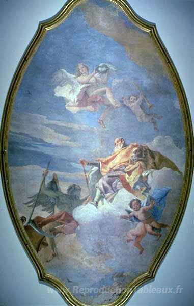 Nous vous proposons une reproduction artisanale sur toile du célèbre tableau 'Le triomphe de la valeur au fil du temps' de Giovanni Domenico Tiepolo, provenant du Musée de la Reproduction.