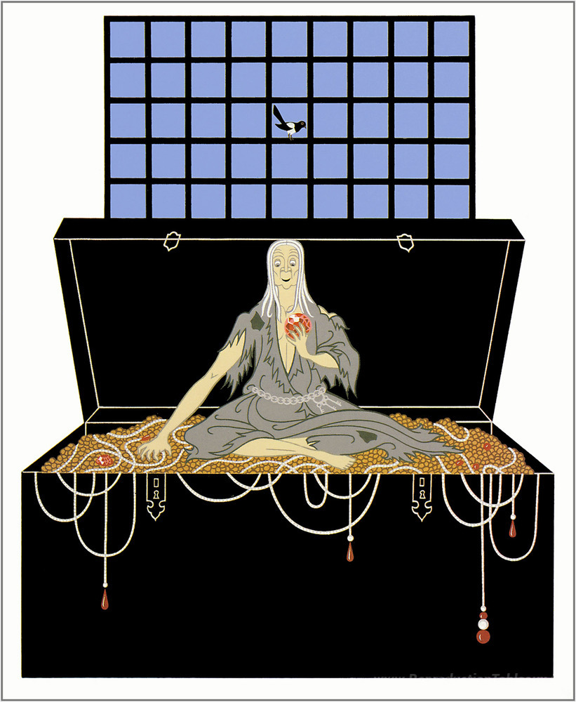 Nous vous proposons une reproduction artisanale sur toile du célèbre tableau 'Les sept péchés mortels, avarice' de Erte, provenant du Musée de la Reproduction.