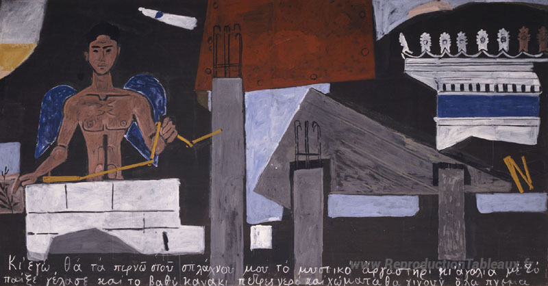 Nous vous proposons une reproduction artisanale sur toile du célèbre tableau 'L'esprit de la technique' de Yiannis Tsaroychis, provenant du Musée de la Reproduction.
