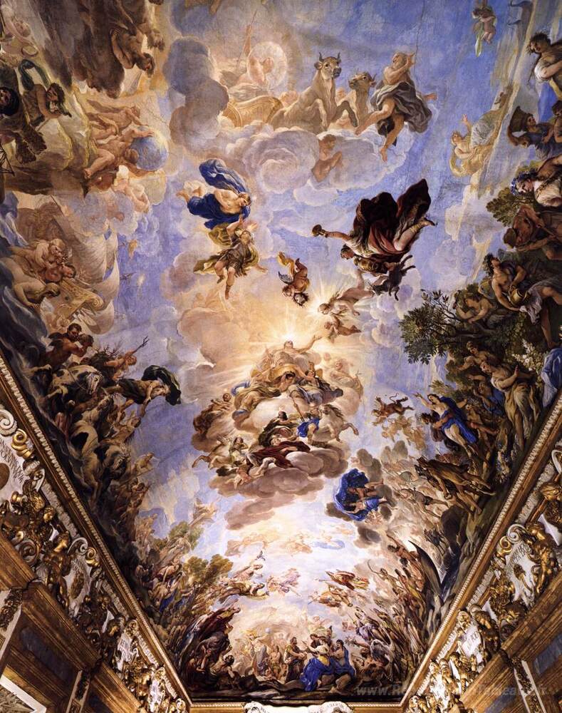 Nous vous proposons une reproduction artisanale sur toile du célèbre tableau 'Plafond décoratif (Palazzo Medici Riccardi)' de Luca Giordano, provenant du Musée de la Reproduction.