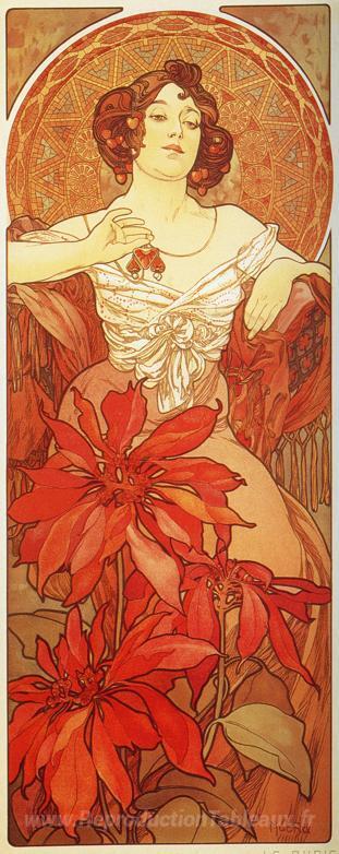 Nous vous proposons une reproduction artisanale sur toile du célèbre tableau 'Rubis' de Alphonse Mucha, provenant du Musée de la Reproduction.