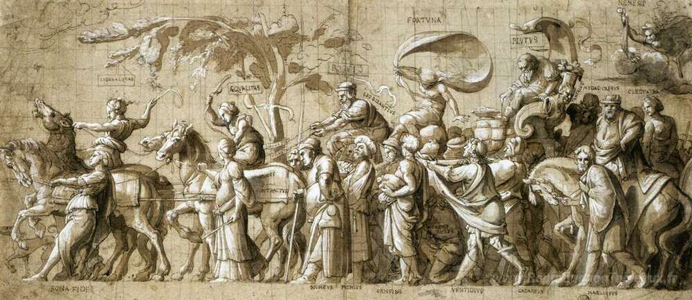 Nous vous proposons une reproduction artisanale sur toile du célèbre tableau 'Triomphe de la richesse' de Hans Holbein the Younger, provenant du Musée de la Reproduction.