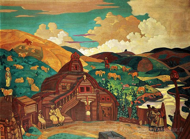 Nous vous proposons une reproduction artisanale sur toile du célèbre tableau 'Trois plaisirs' de Nicholas Roerich, provenant du Musée de la Reproduction.