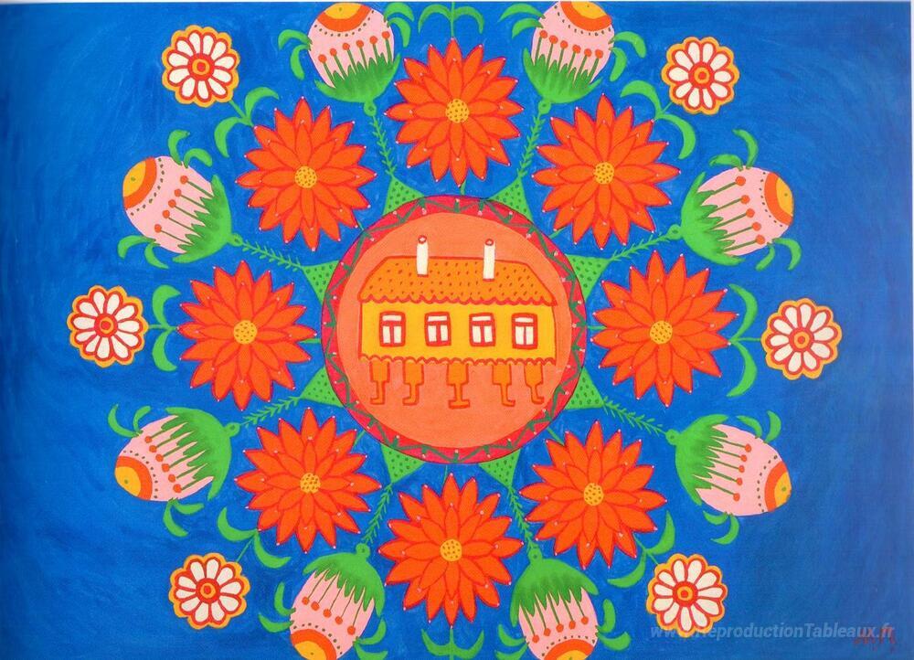 Nous vous proposons une reproduction artisanale sur toile du célèbre tableau 'Une maison spatiale extérieure où les soldats Cosmoc ont passé s' de Maria Primachenko, provenant du Musée de la Reproduction.