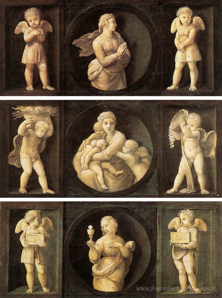 Nous vous proposons une reproduction artisanale sur toile du célèbre tableau 'Vertus théologiques' de Raphael, provenant du Musée de la Reproduction.