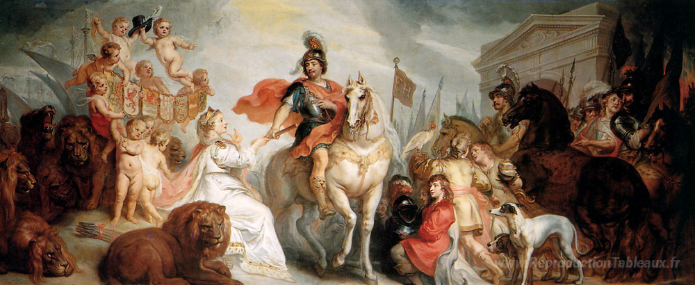 Nous vous proposons une reproduction artisanale sur toile du célèbre tableau 'Vierge néerlandaise et Frederik' de Theodoor van Thulden, provenant du Musée de la Reproduction.
