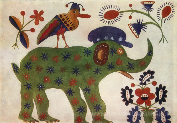 Nous vous proposons une reproduction artisanale sur toile du célèbre tableau 'Éléphant vert' de Maria Primachenko, provenant du Musée de la Reproduction.