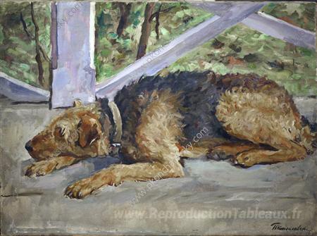 Nous vous proposons une reproduction artisanale sur toile du célèbre tableau 'Airedale sur le balcon' de Pyotr Konchalovsky, provenant du Musée de la Reproduction.