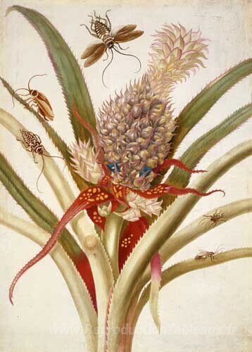 Nous vous proposons une reproduction artisanale sur toile du célèbre tableau 'Ananas et cafards' de Maria Sibylla Merian, provenant du Musée de la Reproduction.