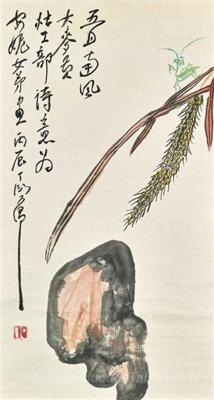 Nous vous proposons une reproduction artisanale sur toile du célèbre tableau 'Blé, pierre et cricket' de Ding Yanyong, provenant du Musée de la Reproduction.