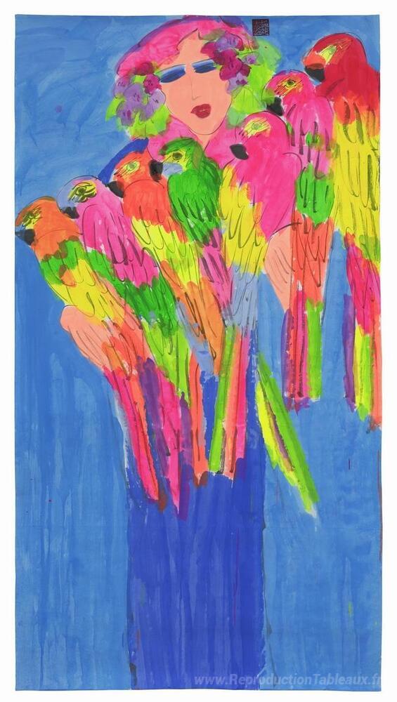 Nous vous proposons une reproduction artisanale sur toile du célèbre tableau 'Blue Dame avec des perroquets' de Walasse Ting, provenant du Musée de la Reproduction.