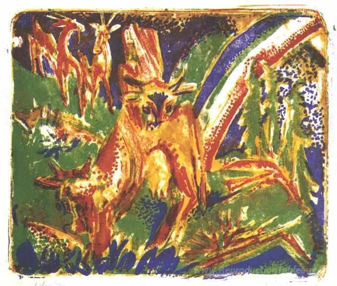 Nous vous proposons une reproduction artisanale sur toile du célèbre tableau 'Cattles sous un arc-en-ciel' de Ernst Ludwig Kirchner, provenant du Musée de la Reproduction.