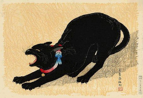 Nous vous proposons une reproduction artisanale sur toile du célèbre tableau 'Chat avec une cloche' de Shotei Takahashi, provenant du Musée de la Reproduction.