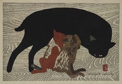Nous vous proposons une reproduction artisanale sur toile du célèbre tableau 'Chat et chatons' de Kiyoshi Saito, provenant du Musée de la Reproduction.