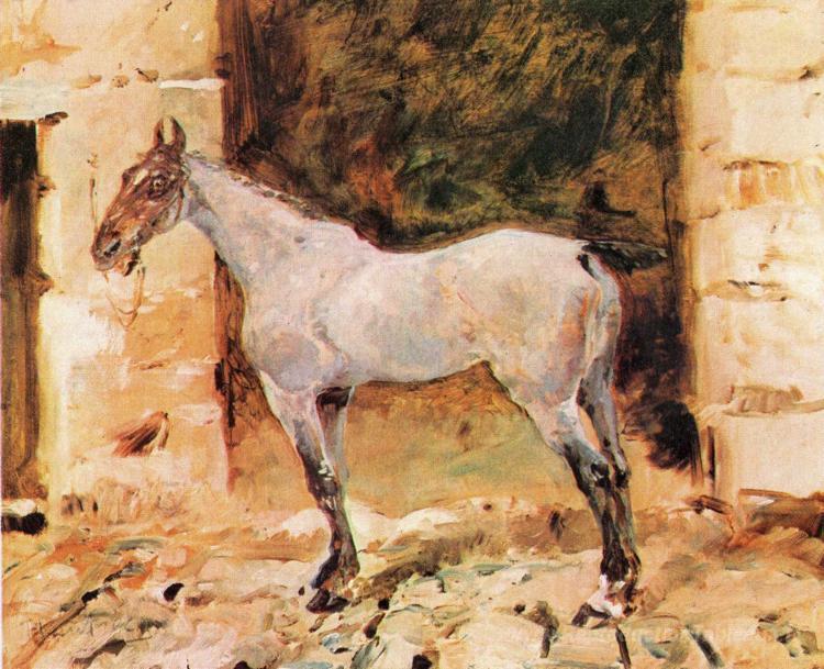 Nous vous proposons une reproduction artisanale sur toile du célèbre tableau 'Cheval attaché' de Henri de Toulouse-Lautrec, provenant du Musée de la Reproduction.