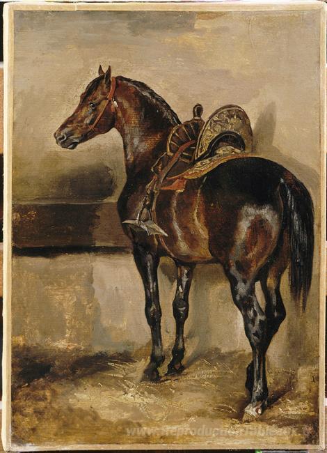 Nous vous proposons une reproduction artisanale sur toile du célèbre tableau 'Cheval turc dans une écurie' de Theodore Gericault, provenant du Musée de la Reproduction.