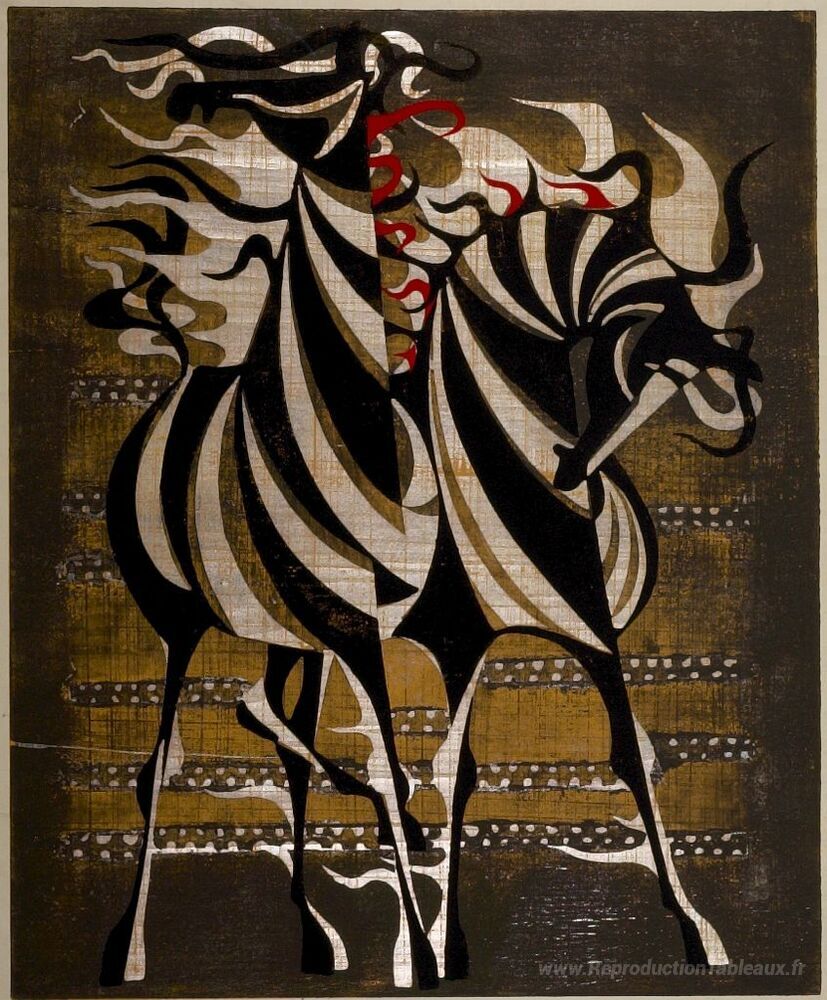 Nous vous proposons une reproduction artisanale sur toile du célèbre tableau 'Chevaux dans l'après-midi' de Tadashi Nakayama, provenant du Musée de la Reproduction.