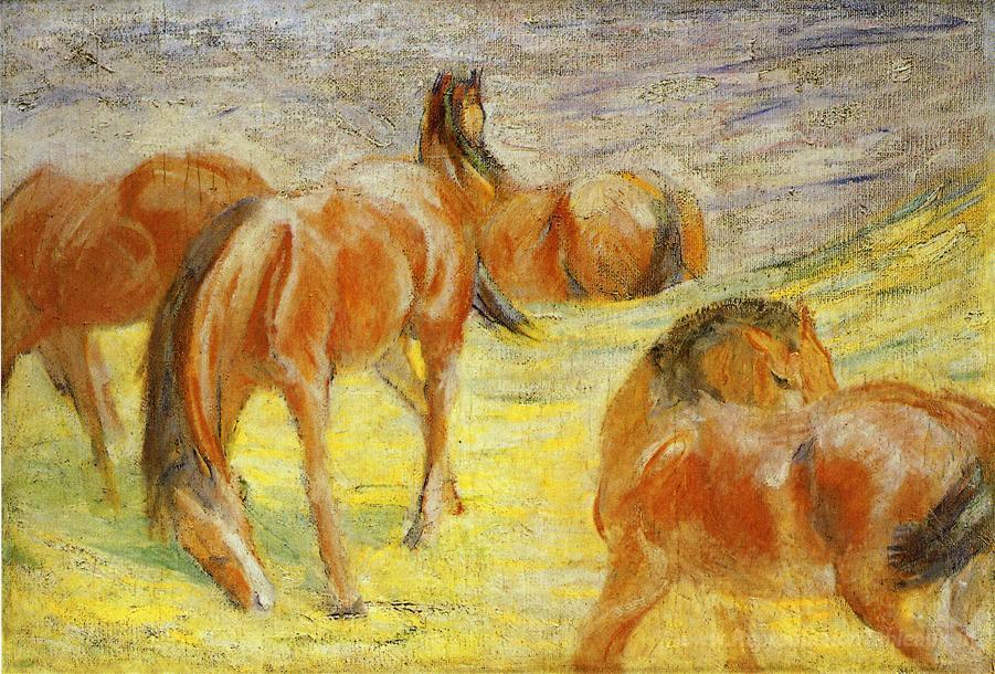 Nous vous proposons une reproduction artisanale sur toile du célèbre tableau 'Chevaux de pâte' de Franz Marc, provenant du Musée de la Reproduction.