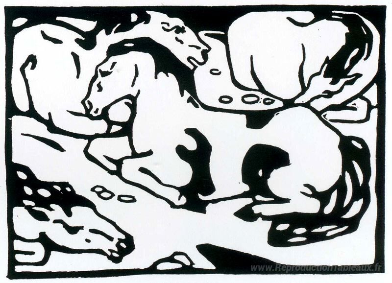 Nous vous proposons une reproduction artisanale sur toile du célèbre tableau 'Chevaux de repos' de Franz Marc, provenant du Musée de la Reproduction.
