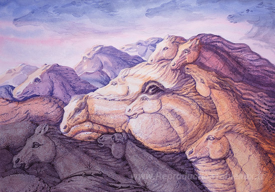 Nous vous proposons une reproduction artisanale sur toile du célèbre tableau 'Courir avec le troupeau' de Octavio Ocampo, provenant du Musée de la Reproduction.