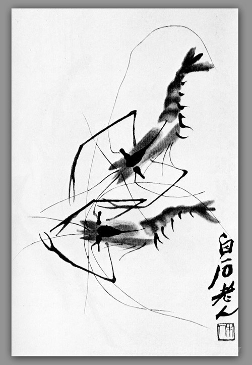 Nous vous proposons une reproduction artisanale sur toile du célèbre tableau 'Crevette' de Qi Baishi, provenant du Musée de la Reproduction.
