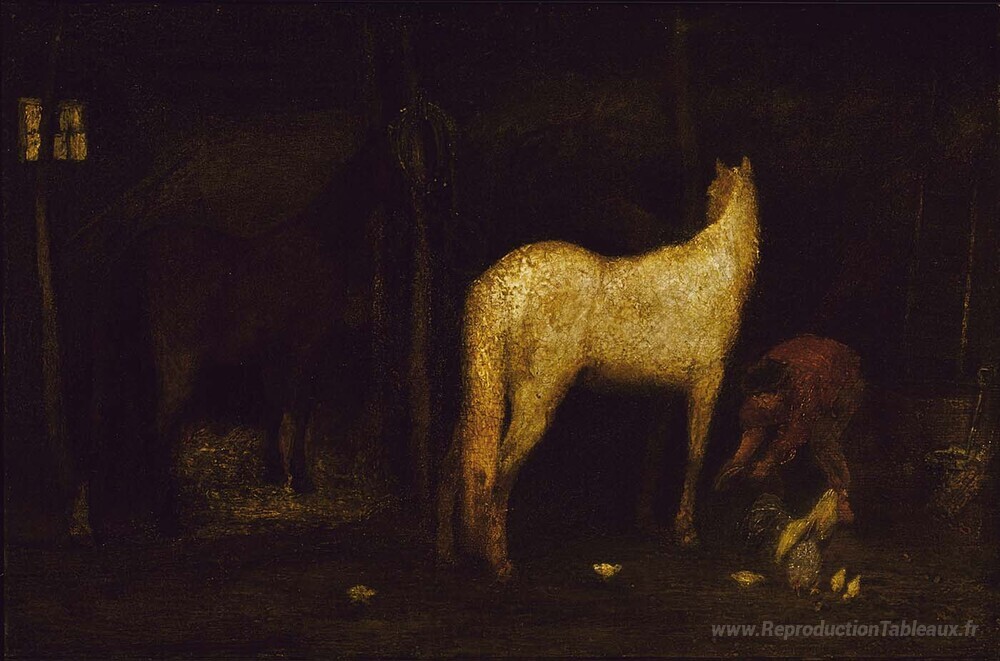 Nous vous proposons une reproduction artisanale sur toile du célèbre tableau 'Dans l'écurie' de Albert Pinkham Ryder, provenant du Musée de la Reproduction.