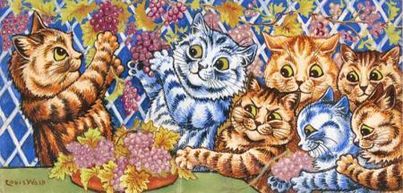 Nous vous proposons une reproduction artisanale sur toile du célèbre tableau 'Dans le vignoble' de Louis Wain, provenant du Musée de la Reproduction.